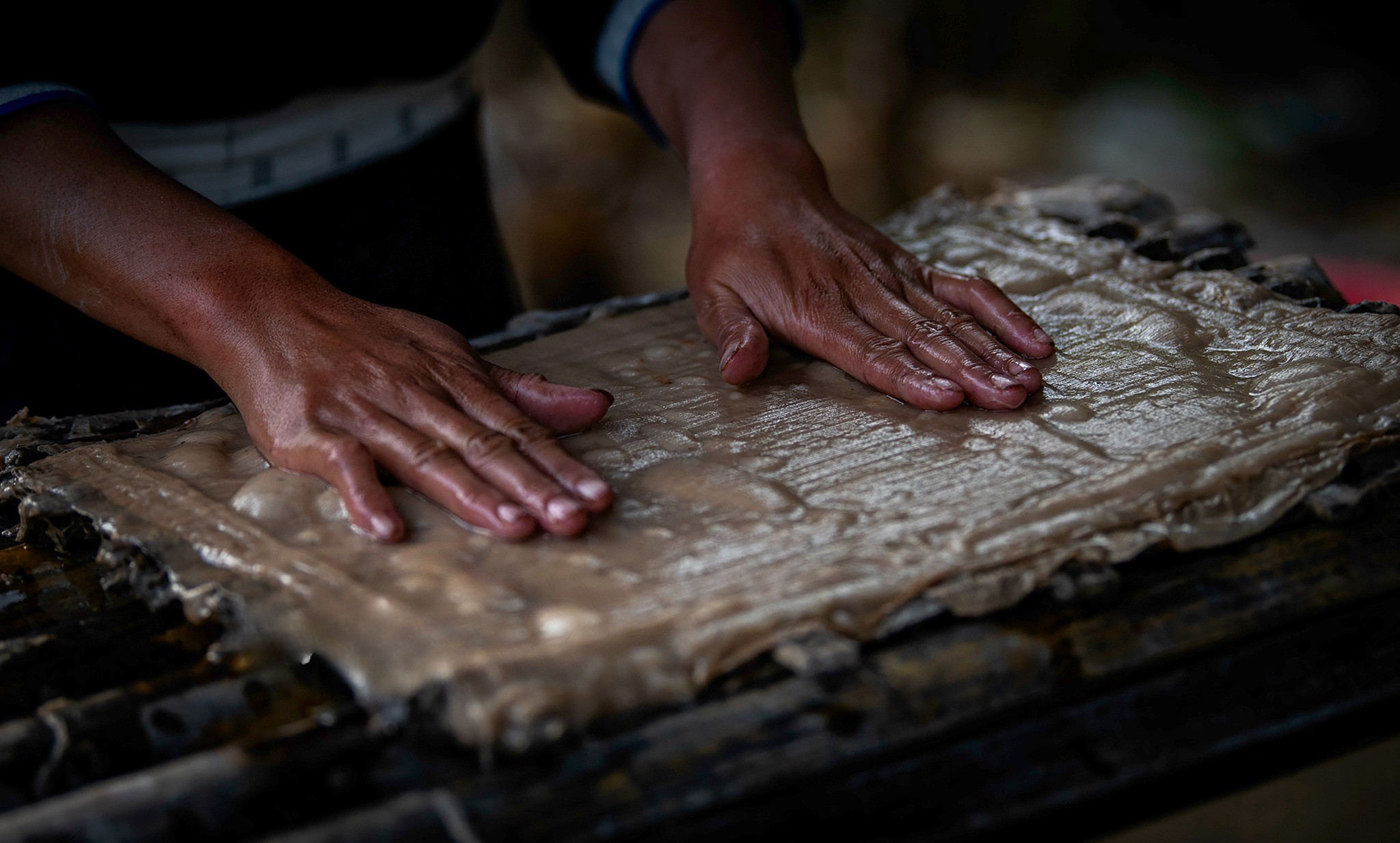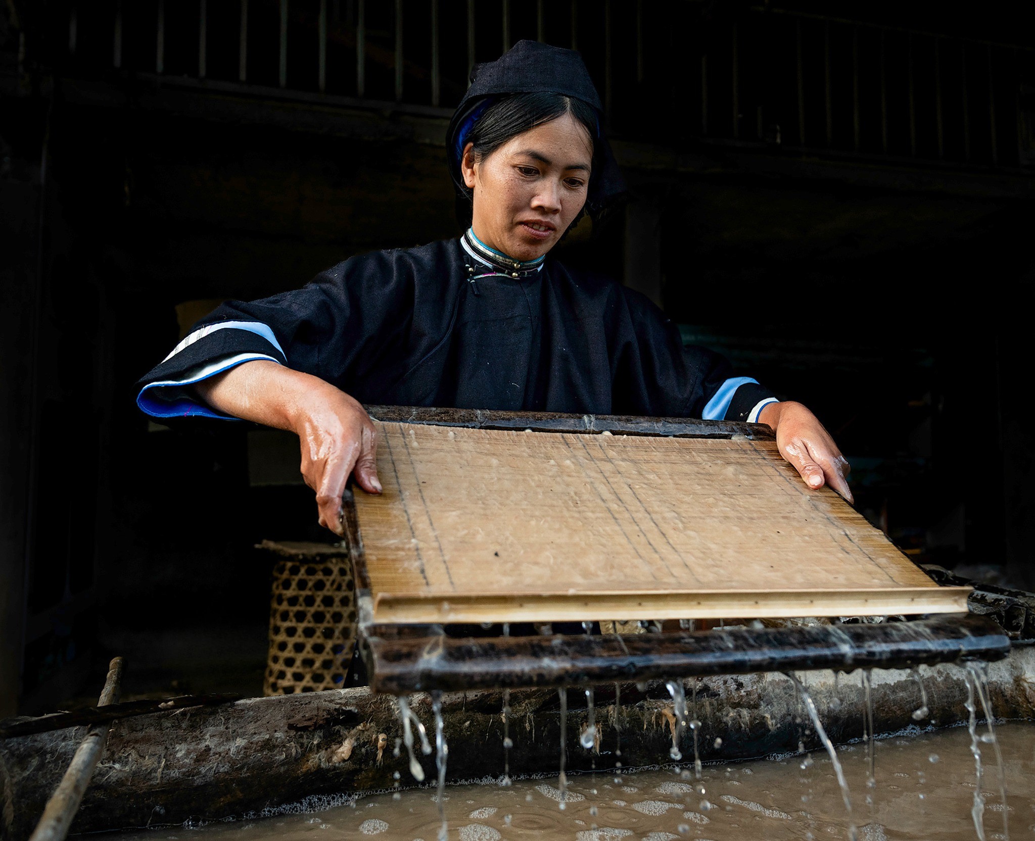 Une fois cuite, l’écorce est soigneusement lavée, puis battue jusqu’à obtenir une pâte fine et homogène. Ce travail manuel est particulièrement exigeant et demande une certaine expérience pour obtenir la bonne texture. La pâte est ensuite mélangée à de l’eau dans une grande cuve, où elle est constamment remuée pour éviter que les fibres ne se déposent de manière irrégulière.