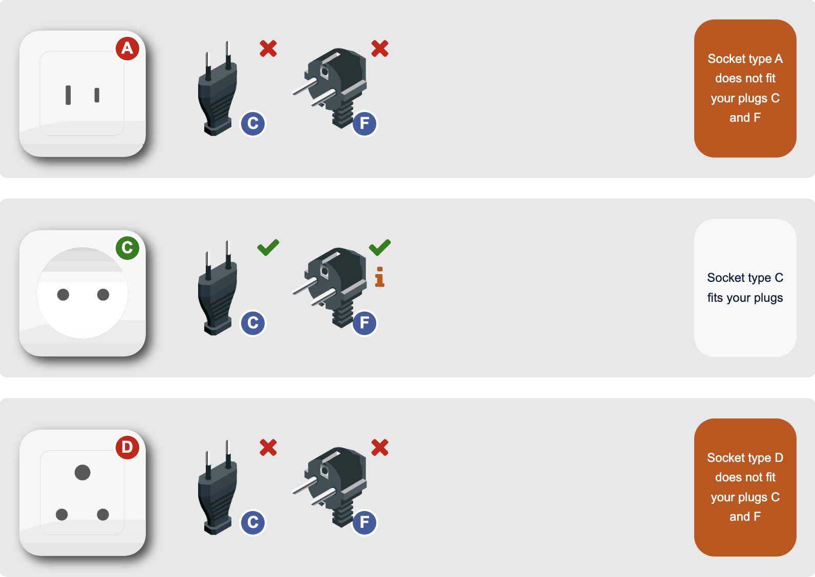 Ces prises ne sont pas toujours uniformes d’un hôtel à l’autre : dans certaines guesthouses ou lieux plus anciens, vous pouvez trouver une combinaison de prises Type A, C et F dans le même espace.