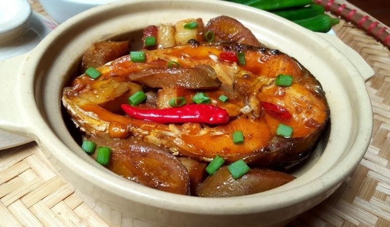 Un plat vietnamien unique où le poisson est mijoté lentement avec des bananes vertes, du caramel, de la sauce de poisson et des épices parfumées. Les bananes encore fermes absorbent la sauce et deviennent tendres, apportant une texture douce-salée spéciale. La saveur offre un équilibre subtil entre le sucré du caramel, le salé du nuoc-mam (sauce de poisson) et la légère amertume des bananes vertes. Ce mets est idéal pour un repas familial chaleureux, surtout lorsqu’il est servi chaud. On le déguste généralement avec du riz blanc fumant pour bien apprécier la sauce riche et brillante qui nappe le tout.