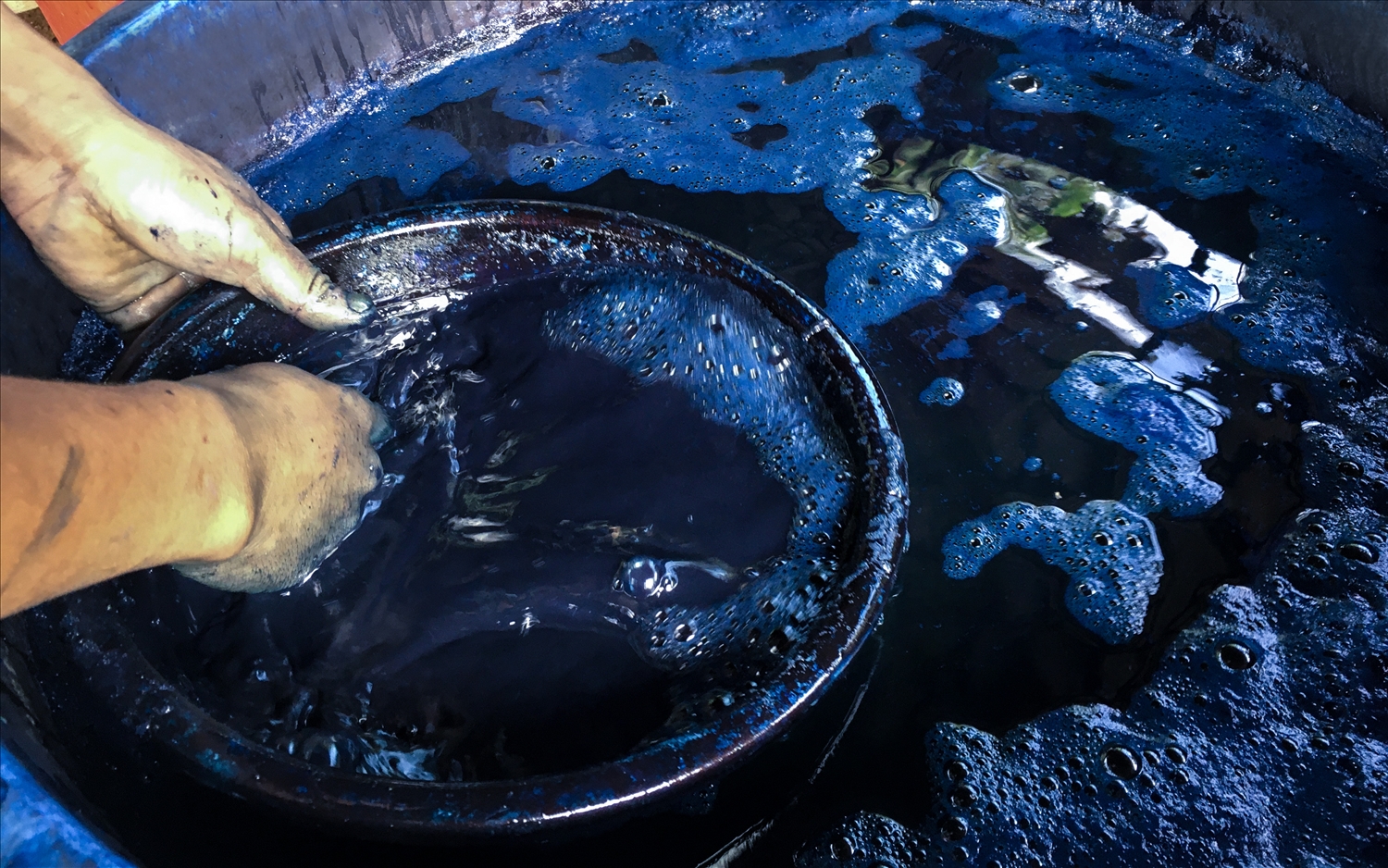 Une fois le liquide prêt, il est filtré et transformé en bain de teinture. Le tissu – généralement du coton ou du chanvre tissé à la main – est alors plongé, retiré, essoré, puis exposé à l’air. C’est à ce moment précis que la magie opère : au contact de l’oxygène, le tissu passe du vert jaunâtre au bleu profond.