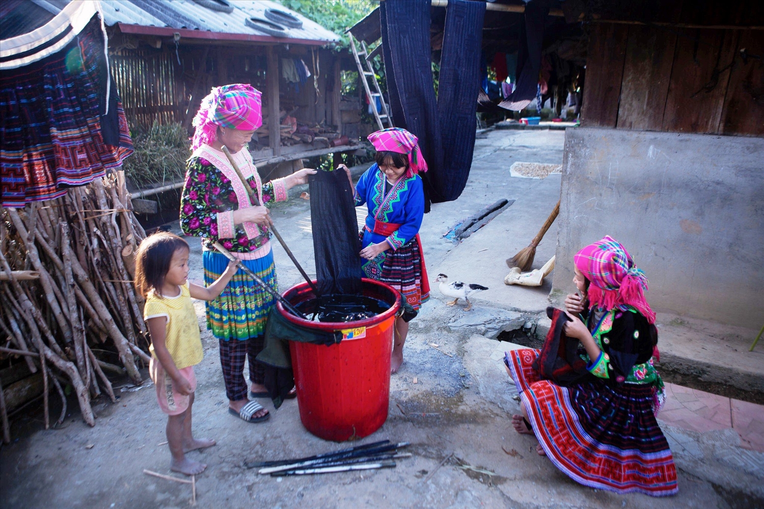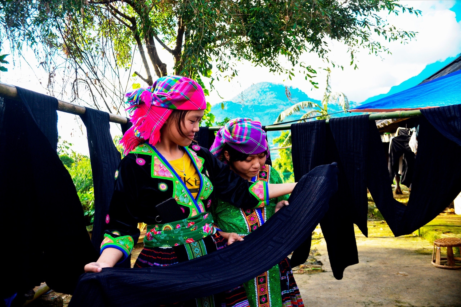 Historiquement, cette teinture s’est développée dans les régions montagneuses du Vietnam, là où vivaient et vivent encore de nombreuses ethnies minoritaires. Le bleu indigo s’est imposé pour des raisons à la fois pratiques et symboliques. Résistant, il protège les tissus contre l’usure et les insectes. Symbolique, il évoque la terre, le ciel, la stabilité et l’appartenance communautaire.
