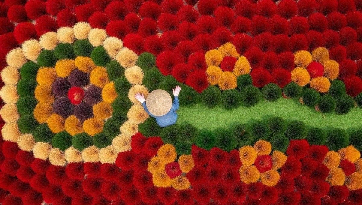 Après l’application de la pâte parfumée, les bâtons d’encens sont disposés en éventail ou en cercle et laissés à sécher au soleil. C’est à ce moment-là que le village révèle son visage le plus spectaculaire. Les cours se transforment en mosaïques colorées, offrant des compositions presque artistiques, entièrement dictées par les besoins du travail quotidien.