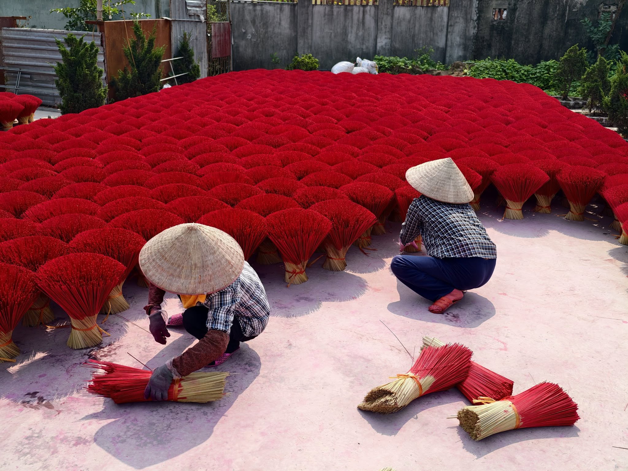 À l’arrivée, les visiteurs sont immédiatement frappés par la dominante rouge éclatante des bâtons d’encens, soigneusement disposés dans les cours, le long des ruelles et devant les maisons. Ce contraste saisissant entre les couleurs vives de l’encens et la simplicité de l’architecture rurale crée une atmosphère unique, difficile à retrouver ailleurs au Vietnam.